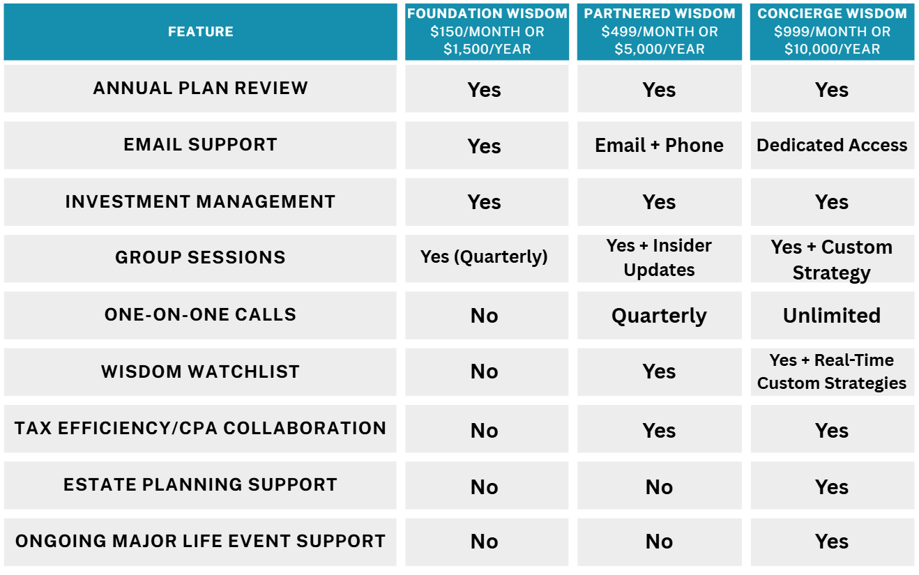 Your $2,000 Wealthy Retirement Plan gives you a clear path forward. But if you want continued guidance, proactive strategy, and personal support. We’ve got you covered. Choose the level of wisdom that fits your life best.